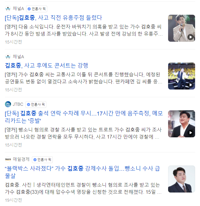 김호중은 뺑소니 사고 당일 사고직전에 유흥주점에 들렸던 것으로 드러났습니다. 하지만 김호중은 유흥주점에 간것은 맞지만 술은 마시지 않았다고 주장했는데요. 그렇다면 왜 17시간이나 지난 후 자수를 하였는지에 대해서는 '사고 이후에 김호중 씨가 심각한 공황장애가 왔기 때문'이라고 하였습니다. 하지만 누가 봐도 심상치 않은 행동에 의구심이 들며, 많은 사람들에게 사랑을 받는 대중가수로써 태도가 현명하지 못했다고 생각합니다. 경찰은 차량 내 블랙박스 메모리 카드가 빠져있던것으로 확인 후 압수수색 영장을 신청해 둔 상태입니다. 현장에 먼저 도착한 다른 매니저가 고의로 블랙박스 메모리 카드를 숨긴 것인데요. 이 경우 증거인멸 등 혐의가 적용될 것으로 봅니다. 대중들에게 모범을 보여야 하나 공황장애 등을 이용하여 물의를 일으킨 것 이 어떤 게 진실인지는 모르겠으나 이로 인하여 많은 분들이 실망했음에도 불구하고 팬들은 '그럴 수 있지'라는 반응을 보이는 경우가 있어 더 많은 사람들의 분노를 사게 되었습니다. 올바른 대처가 필요했음에도 불구하고 사람이니 실수할 수 있다고 하는 부분에 대하여 많은 생각을 하게 됩니다. 잘못한 부분은 인정하며 법적인 올바른 처벌은 받으시길 바랍니다.