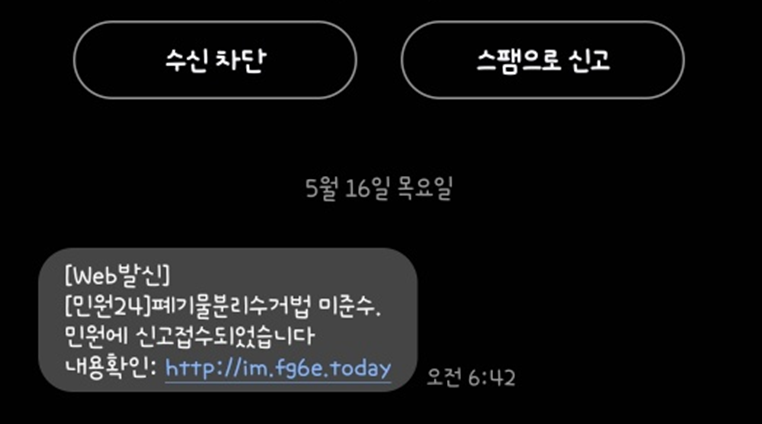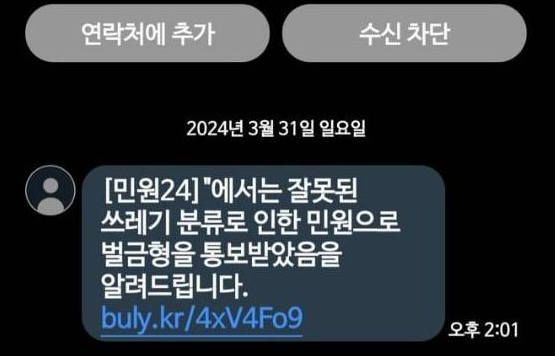 기존에는 전화통화로 사기를 치는 방식 보이스피싱이 많았다면 최근에는 스미싱사기가 늘고 있는데요, 이 스미싱 사기는 전화통화가 아닌 문자메시지나 카톡으로 이루어지고 있는 수법을 말합니다. 보통 메시지에 있는 주소를 통하여 악성 앱을 설치하게 하여 개인정보를 빼내어가거나 금전을 요구하는 메시지로 사람들을 속이는데요 최근에는 음식물 분리수거 위반 문자, 폐기물 분리수거 위반 문자로 피해를 보시는 분들이 늘었습니다.