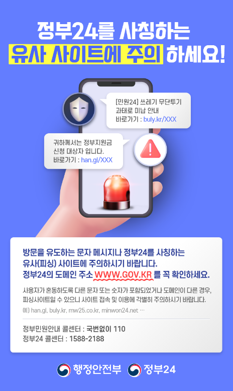 위사이트가 대충 보시면 누구나 속을만한 정부 24 사이트지만, 자세히 보시면 배열 등 많은 것이 다르다는 것을 정부 24 사이트를 이용해 보신 분들이라면 아실 수 있을 것입니다. 그러나 어르신들 경우 모르시는 경우가 많으니 특히 미리미리 어떠한 문자가 오더라도 클릭을 하시면 안 되는 걸 안내해 주시기 바랍니다. '정부 24를 사칭하는 유사사이트에 주의하세요'