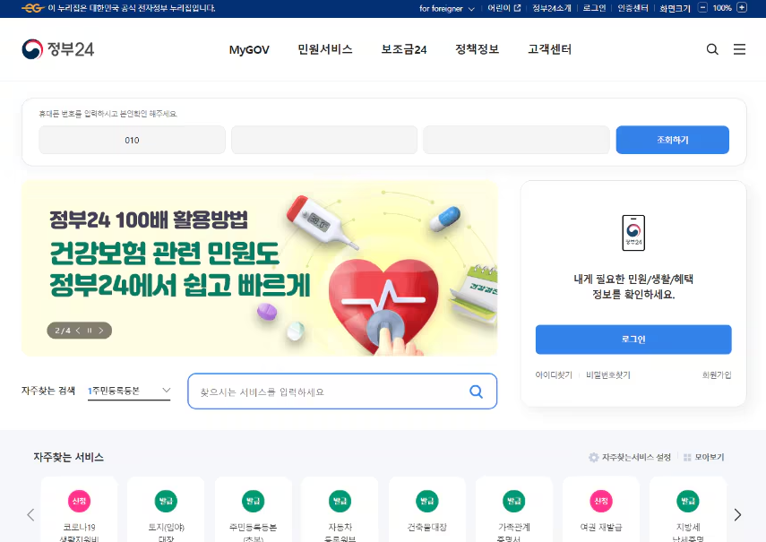 이런 문자를 받은 경우 당황해서 클릭을 하시는 경우가 있으신데요, 요즘은 클릭시 정말 감쪽 같이 속을 만큼에 정부 24 사이트가 나오게 됩니다. 보통 정부 24 사이트로 연결되기 때문에 의심 없이 휴대폰번호를 입력하며 개인정보를 유출하게 되는데요, 휴대폰 인증을 하는 순간부터 개인정보 유출에 노출됩니다.